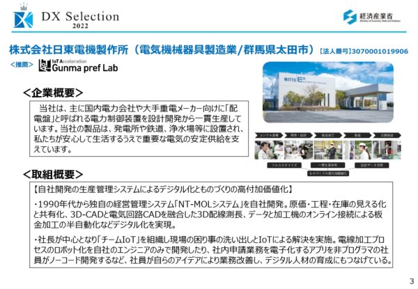 この度株式会社日東電機製作所は、経済産業省よりDXセレクション2022 「準グランプリ」を受賞いたしました。
